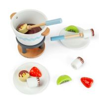 Bjud in din lilla till en mysig chokladfondue för två med detta söta lekset i trä. Setet innehåller en liten chokladburk och massor av läckra godsaker som bara väntar på att doppas i den "smälta" chokladen.