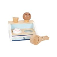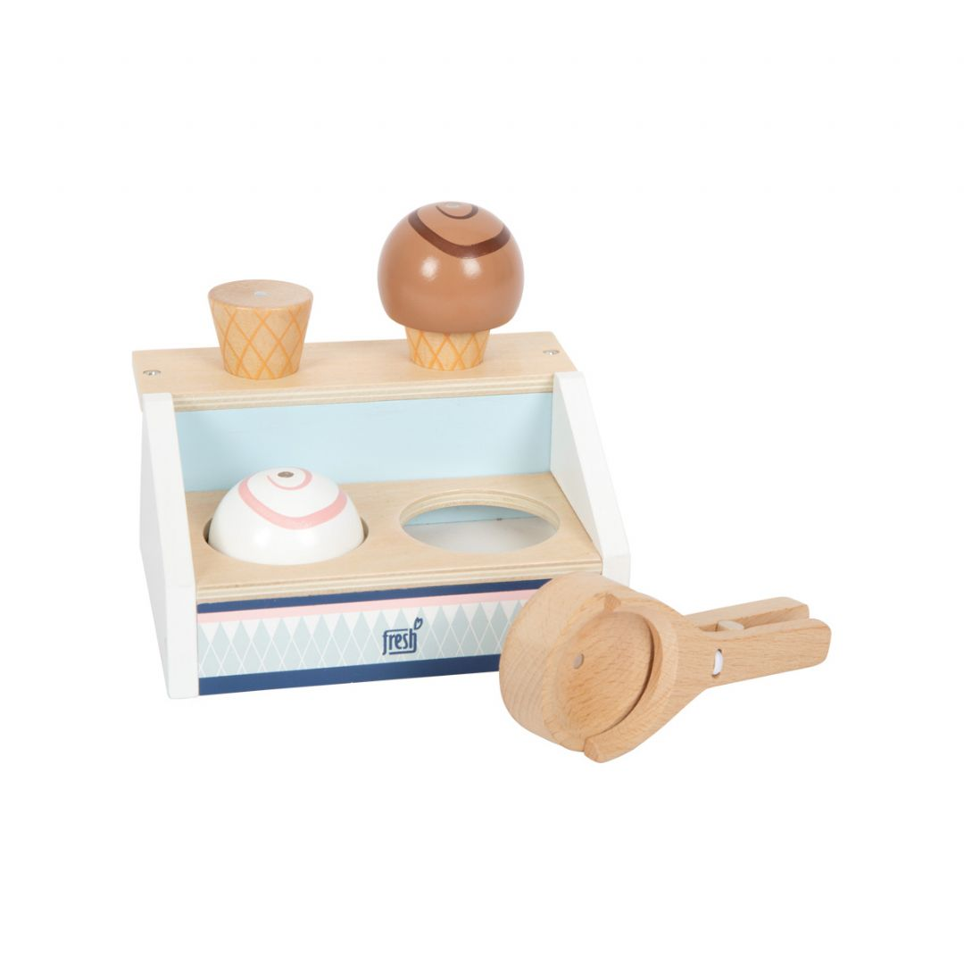 Jippie, vi äter glass idag! Detta är lillasystern till det större Fresh-glassstället och det passar utmärkt i små lekkök eller som ett komplement till lekbutiken i barnrummet med sin minimalistiska design och massor av naturligt trämaterial. De två kulorna glass, två glasstrutar och glassdisken med magneter är utformade på ett sätt som gör att du enkelt kan ta bort glassstrutarna från disken och placera dem på glasstrutarna. Tack vare deras magneter kan båda kulorna glass också staplas. Höjdpunkten i leksetet är den magnetiska glassdisken - med ett lätt knapptryck kan du lägga glassen på struten! Detta glasslekset är tillverkat av FSC® 100 % certifierat trä och kommer definitivt att få dig på humör för en läcker glassgodis från glasscaféet i barnrummet! Utrymmena i disken, lämpliga för varje kula glass, håller allt organiserat. Det kompakta Fresh-glassstället passar bra till Fresh-glasspinnarna (12417), eftersom proportionerna och färgschemat kompletterar varandra väl.