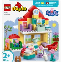 Huset har flera rum som ger gott om möjligheter att skapa små berättelser: sovrum för Peppa och Gustav (George), ett badrum, kök och vardagsrum. Barnet kan flytta runt figurerna, hitta på nya scenarier och återberätta scener från TV-serien. Setet innehåller hela familjen med 5 DUPLO-figurer: Mamma Gris, Pappa Gris, Peppa, Gustav och lilla Evie. Speciellt babyfiguren gör familjeleken extra rolig eftersom barnet kan öva på omtanke, empati och sociala färdigheter – till exempel att ta med barnet på en promenad, mata det eller söva det.