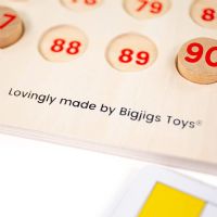 Setet innehåller träbitar med nummer, spelplaner, ett bingobräde i trä och en praktisk tygpåse för förvaring av pjäserna. Tillverkat av högkvalitativa material från ansvarsfulla källor.