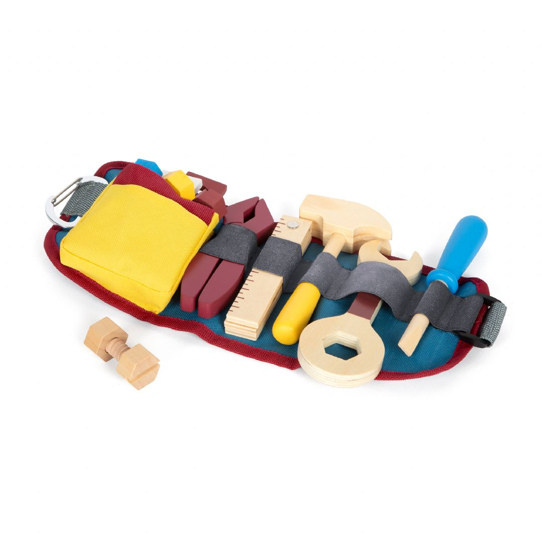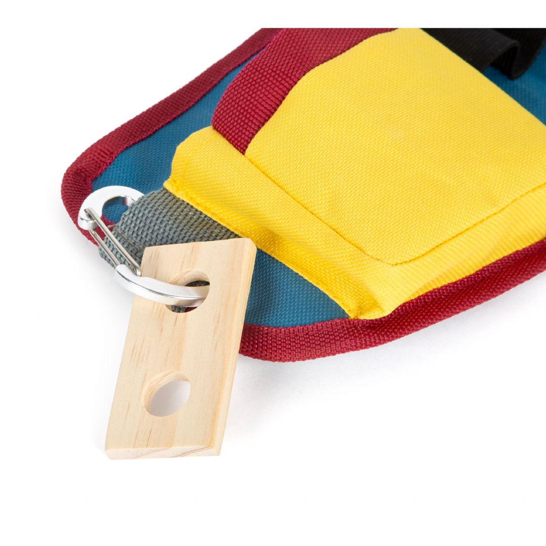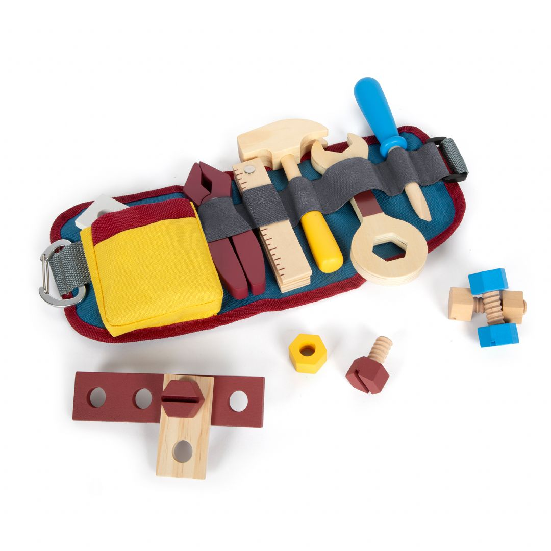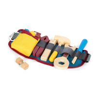 Ett bälte som praktisk verktygsförvaring! Med detta justerbara verktygsbälte kan unga hantverkare hålla händerna fria medan deras utrustning fortfarande är nära till hands! Setet innehåller realistiska verktyg och tillbehör, såsom en träskruvmejsel, skiftnyckel, hammare, tång och ett hopfällbart måttband. Dessutom ingår byggsatser bestående av två små skruvar, två stora skruvar och fyra muttrar. Bältet har ett praktiskt klickspänne. Alla verktyg och utrustning kan hängas på bältet med en krok, vilket gör dem lättillgängliga! Bältet är också lämpligt när du är på språng.
