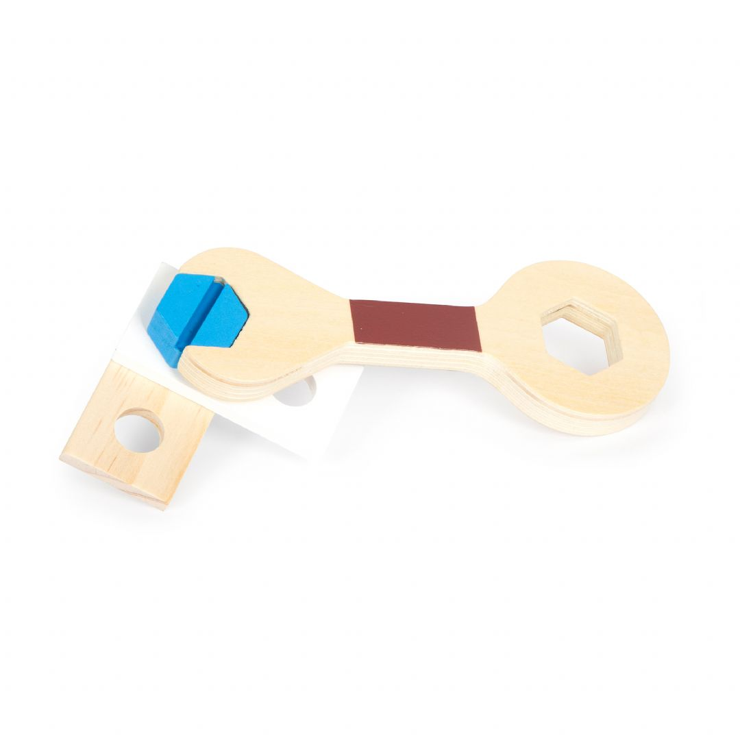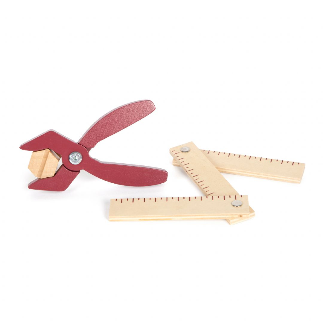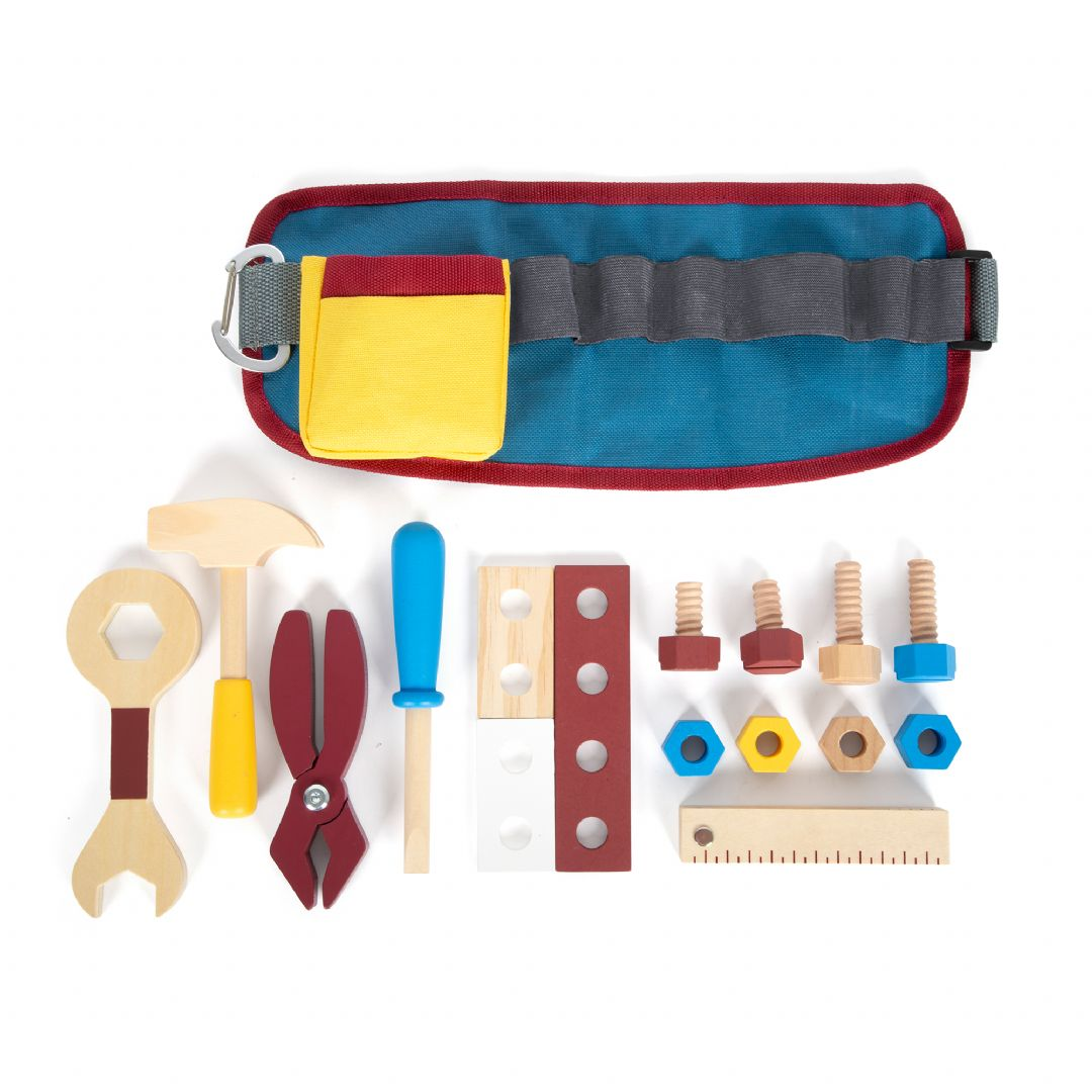 Ett bälte som praktisk verktygsförvaring! Med detta justerbara verktygsbälte kan unga hantverkare hålla händerna fria medan deras utrustning fortfarande är nära till hands! Setet innehåller realistiska verktyg och tillbehör, såsom en träskruvmejsel, skiftnyckel, hammare, tång och ett hopfällbart måttband. Dessutom ingår byggsatser bestående av två små skruvar, två stora skruvar och fyra muttrar. Bältet har ett praktiskt klickspänne. Alla verktyg och utrustning kan hängas på bältet med en krok, vilket gör dem lättillgängliga! Bältet är också lämpligt när du är på språng.